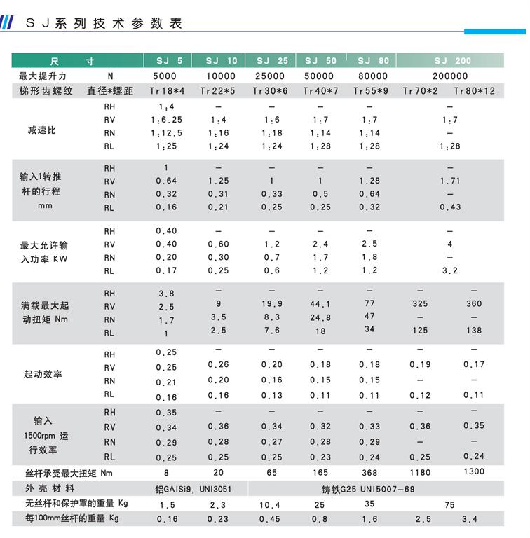 SJ係列升降機有_的設計,緊湊的箱體,比MA係列價格更低,工作製也低。MA係列齒輪箱體設(shè)計更適(shì)合於重負載、高工作製的場合。SJ係(xì)列的負載範(fàn)圍(wéi)在0.5噸~20噸之間,推杆線速度_快可達到30mm/s,輸入速度_為1500r/min;輸入形式多樣,10分鍾的(de)工作製為20%,工作環境溫度為-10℃~70℃;而MA係列的負載_可達到35噸(dūn),輸(shū)入速度更是(shì)_達到3000r/min,可提供雙(shuāng)頭三頭絲杆和滾珠絲杆;附件配置多:限位(wèi)開關,防塵罩,安全螺母,防反轉裝置。10分鍾的工作製為30%(環境溫度為-10℃~70℃)。