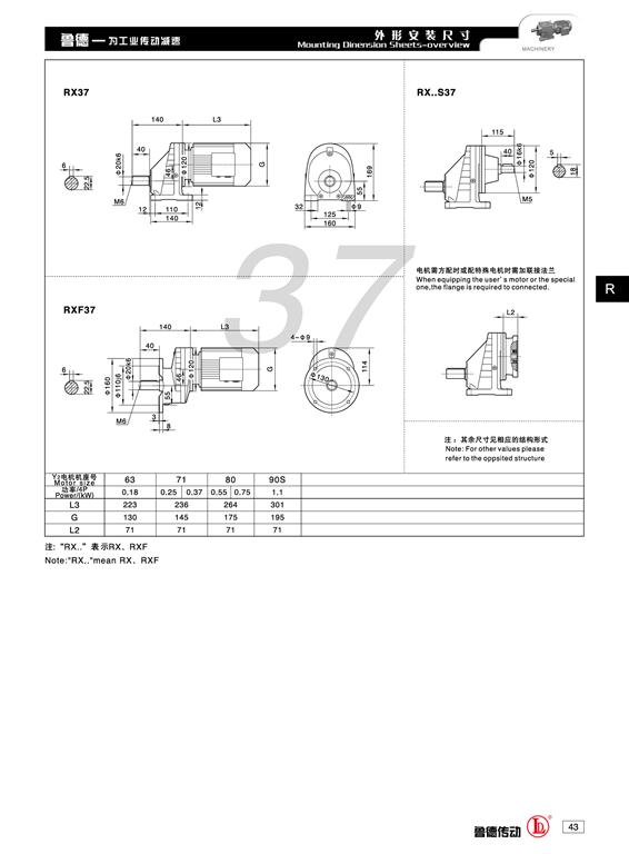 R37齒輪減速機有R、RF、RX、RXF結構型式(shì)可(kě)選(xuǎn)擇。R為(wéi)普通軸伸式;RF為軸伸法蘭(lán)式;RX普通軸伸式,軸輸入;RXF軸伸法蘭式,軸輸入。