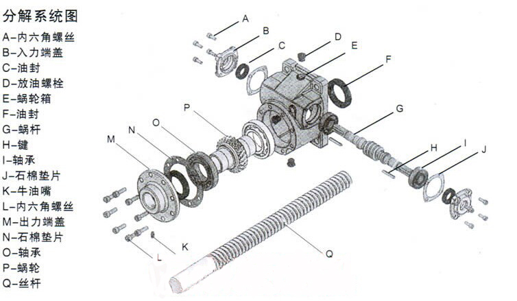 蝸輪絲杆升(shēng)降機蝸輪采用國標9-4銅蝸杆(gǎn)材質為40Cr,絲杆(gǎn)一般采用45#鋼,也可根據用戶特殊需要定製不鏽鋼絲杠。絲杆升降機蝸杆和絲杠都_經特(tè)殊(shū)熱處理及蝸杆磨磨製。