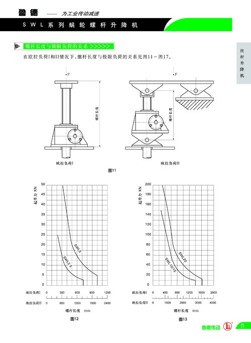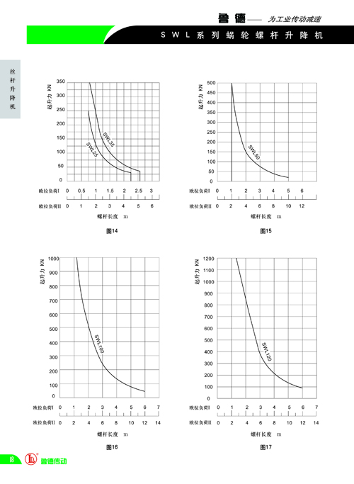 上圖給出了允許彎曲力矩(jǔ)下,螺杆的長度與_負荷的關係。根據螺(luó)杆的行程和起(qǐ)升負荷,查出所需升降機的(de)型號,再根據查(chá)出的升降機型號和起升(shēng)負荷查出蝸輪絲杆升降機的在(zài)不同起升負(fù)荷下允許的起升(shēng)速度,若查出的起升速度滿足不了要求,則須選用型號大一規格的升降(jiàng)機,直至滿足要求。