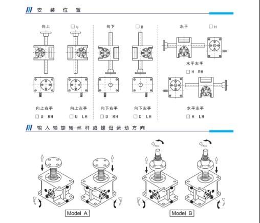 SJ蝸輪絲杆升降機有絲杆運動螺旋升降機和螺母運動螺旋升降機兩種(zhǒng)運動形式。絲杆運動式即蝸輪旋轉驅動(dòng)絲(sī)杆直線(xiàn)運動;運行中絲杆不旋轉(zhuǎn),絲杆運(yùn)行上下需有足夠空間(jiān)。螺母運動式即絲杆與蝸輪固定,驅動螺母上下直線運動(dòng),運行中絲杆旋轉。