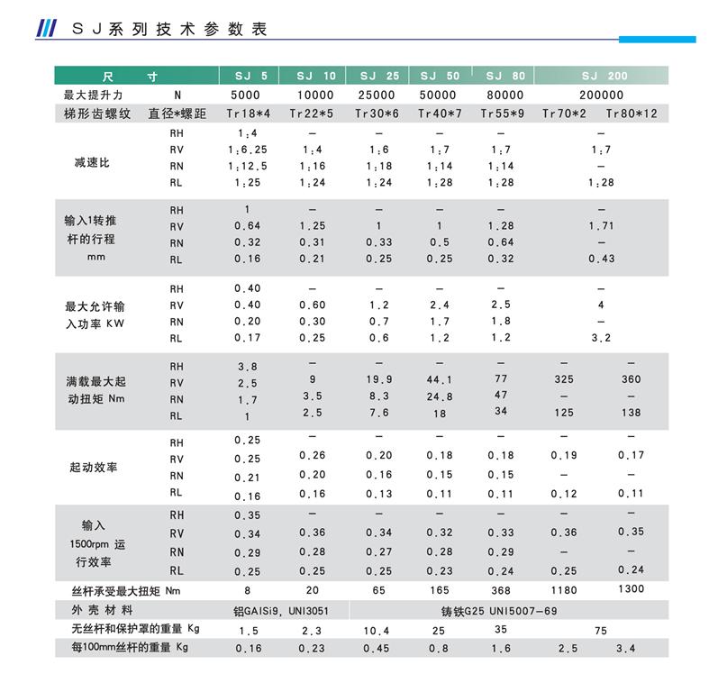 SJ螺旋絲杆升降機的負載範圍為0.5T~20T,推杆線速可至30mm/s,輸入速度_為1500rpm,輸入型式(shì)多樣。多方位安裝使用。