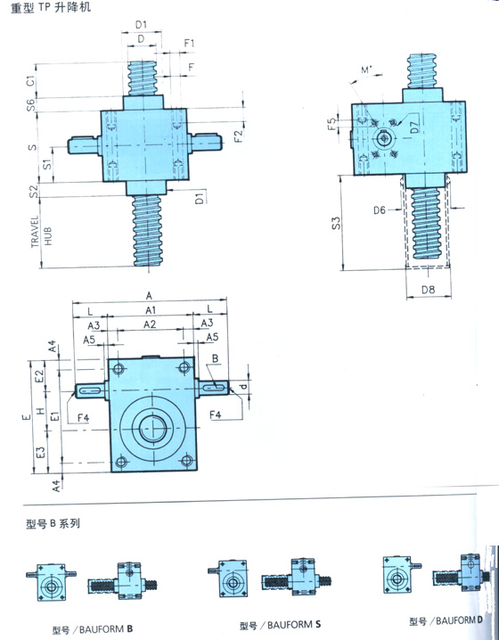TP係列升降機,TP升降機:TP機械絲杠升降機操作簡(jiǎn)單,可靠性強,低維(wéi)修率等優點, 使螺旋千斤頂有著廣闊的應用範圍.TP機(jī)械千斤頂配有自 動連鎖機構,即他(tā)們能(néng)支撐自身重量而不必(bì)采用閘或其它 鎖定係(xì)統.千斤頂可單獨使用也可與軸、聯軸(zhóu)節,傘(sǎn)齒輪傳動器結合共同使用。他們可由交流或直流電機驅動,也可由液壓或氣壓(yā)電機驅(qū)動(dòng),他們可手(shǒu)動(dòng)驅動也可用其它傳動形式;