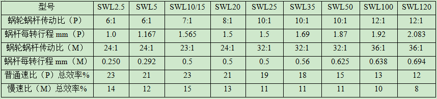 通常蝸輪絲杆升(shēng)降機的速比有快速和(hé)慢速兩種(zhǒng),快速普通(tōng)速比(P)為6:1,每分鍾行(háng)走速度為1670mm;慢速為24:1,每分(fèn)鍾行走(zǒu)400mm。在同一個型號下(xià)的絲杆升降機,普通速比的傳動要比慢速的小,蝸杆的每轉要(yào)比慢速的長一些,慢(màn)速的絲杆升降機在總效率上比不上普通(tōng)速比(bǐ)的絲杆升降機